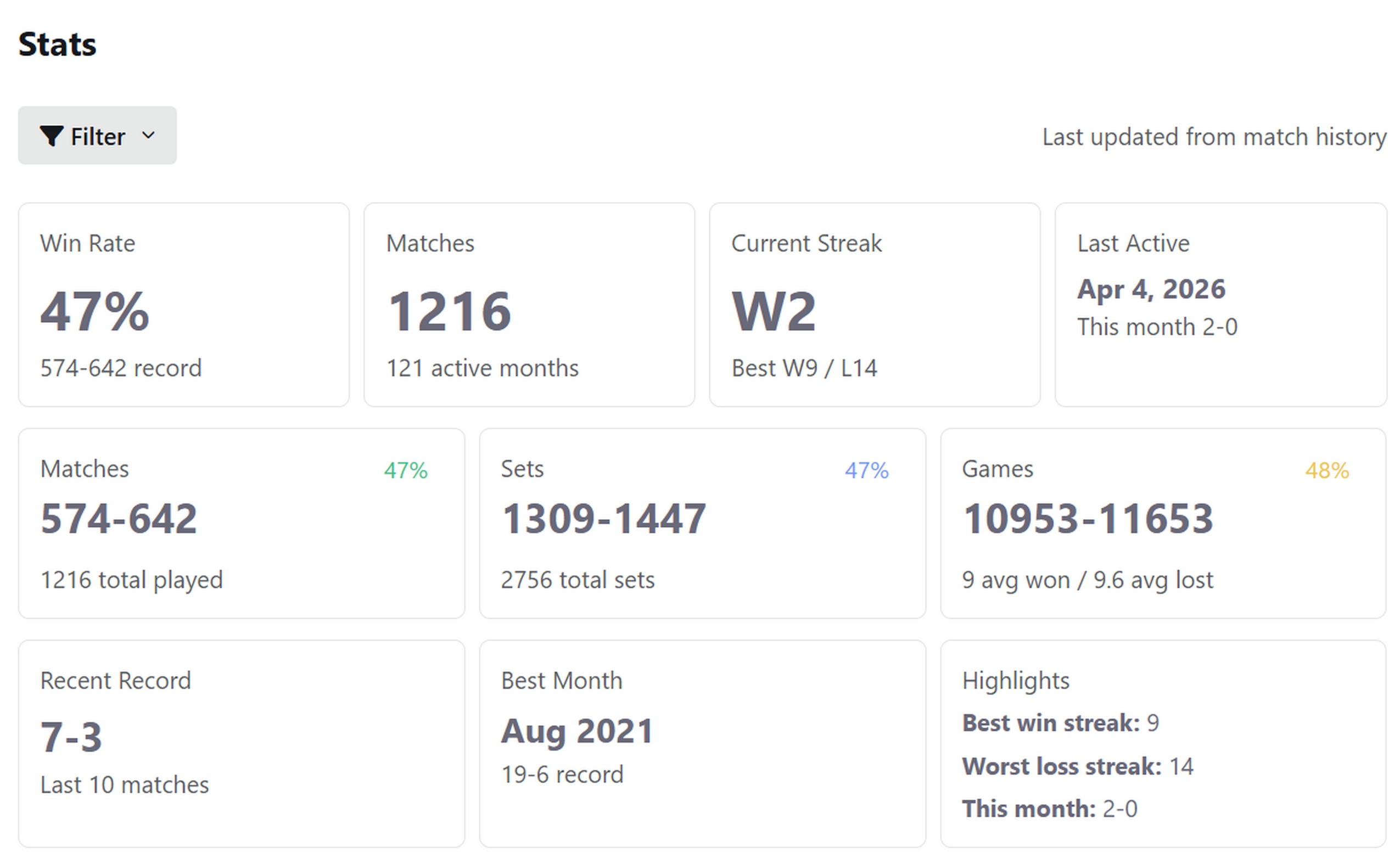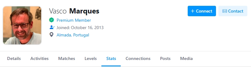 A plataforma Global Tennis Network implementou recentemente, para os membros "premium", melhorias na página de estatísticas dos jogadores, tornando-a ainda mais completa e informativa. Na imagem abaixo, podem ser consultadas as estatísticas, referentes apenas a jogos de singulares do torneio escada, do jogador com maior número de partidas disputadas, Vasco Marques.